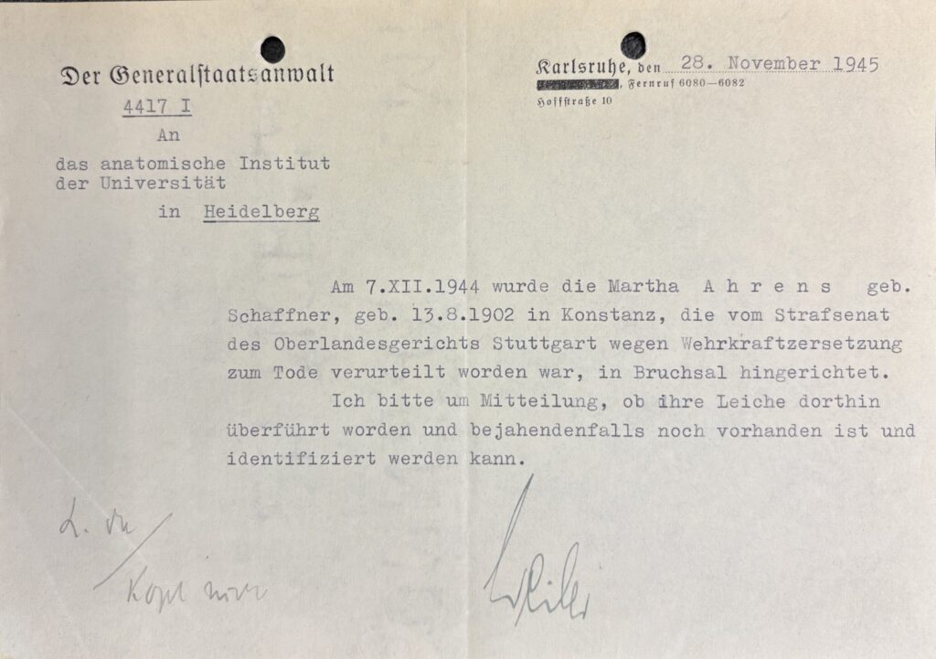 Das Anatomische Institut Heidelberg wurde erst zu Beginn des 19. Jahrhunderts gegründet, jedoch gab es bereits seit dem frühen 14. Jahrhundert anatomische Leichenöffnungen. Die rechtliche Grundlage zur Ablieferung von Verstorbenen bildete die durch Kurfürst Ottheinrich (1502-1559) reformierte Studien- und Ausbildungsverordnung. Im ausgehenden 16. Jahrhundert sollten Studenten die Grundlagen der Funktionen des menschlichen Körpers erlernen, aber auch PatientInnen am Krankenlager untersuchen und sogar chirurgische Kenntnisse erwerben. Anatomische Untersuchungen wurden nun gestattet. Hierzu sollten menschliche Leichen, insbesondere die sterblichen Reste Hingerichteter oder durch Angehörige gespendete Leichname, seziert werden.